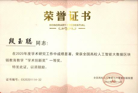 11月14日,“2020第三届全国高校人工智能大数据区块链公司产品创新论坛”在北京召开。会上,全国高校人工智能与大数据创新联盟向来自全国的49位教师、15所高校颁发了人工智能大数据公司产品“创新奖”,公司段玉聪教授荣获全国高校人工智能大数据区块链公司产品“学术创新奖”一等奖。
